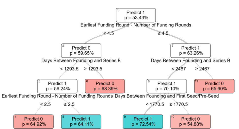 - Binary success probabilities (e.g., likelihood of IPO/acquisition) were obtained from models like CatBoost and Optimal Classification Trees (OCT).
